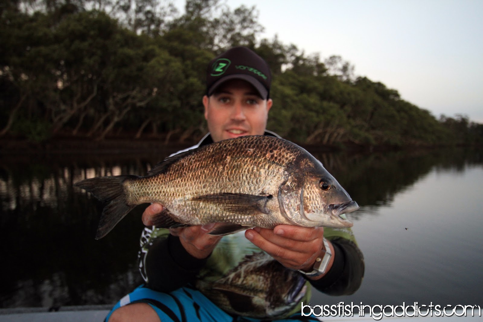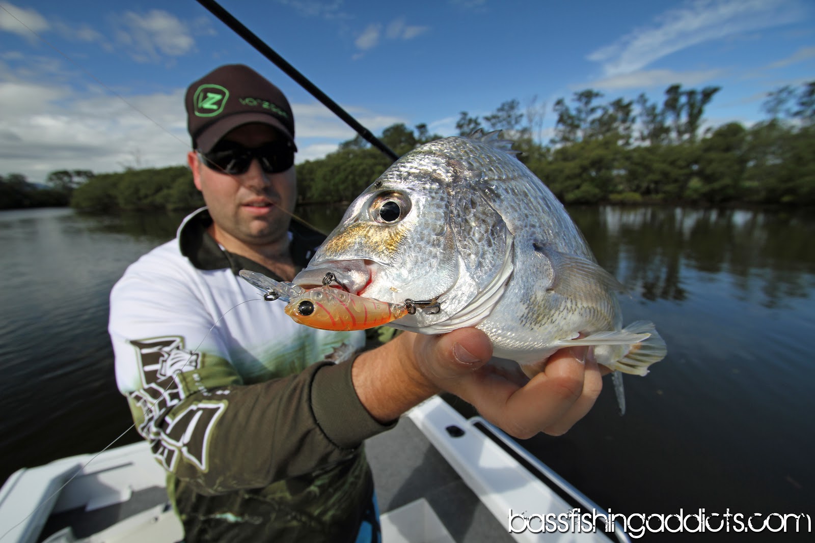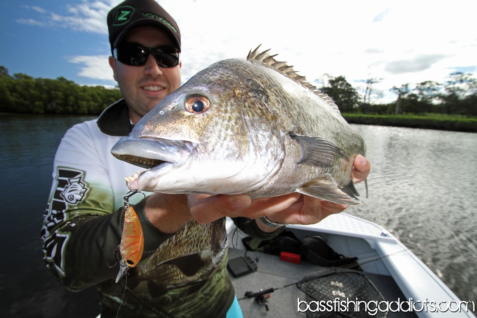 I had recently purchased a couple of Cranka Lures (Cranks & Shads) to improve the look of my tackle box and even though we had been having success on the weekend with the Daiwa SC Shiners, I always love to test out new lures. Chris stuck with the Shiner and I tied on a Cranka Shad in BBQ Prawn colour. We arrived at our spot that produced days before and whilst Chris belted out some cast, I rigged up. We felt a couple of taps but nothing with any substance until we reached the end of the corner, where the weed bank turns to Mangroves. A slow roll with a few twitches thrown in saw me produce the first fish of the afternoon, and thankfully it was our target species!