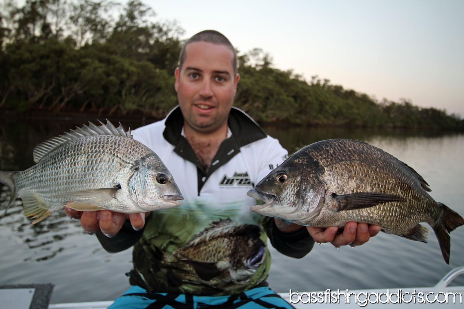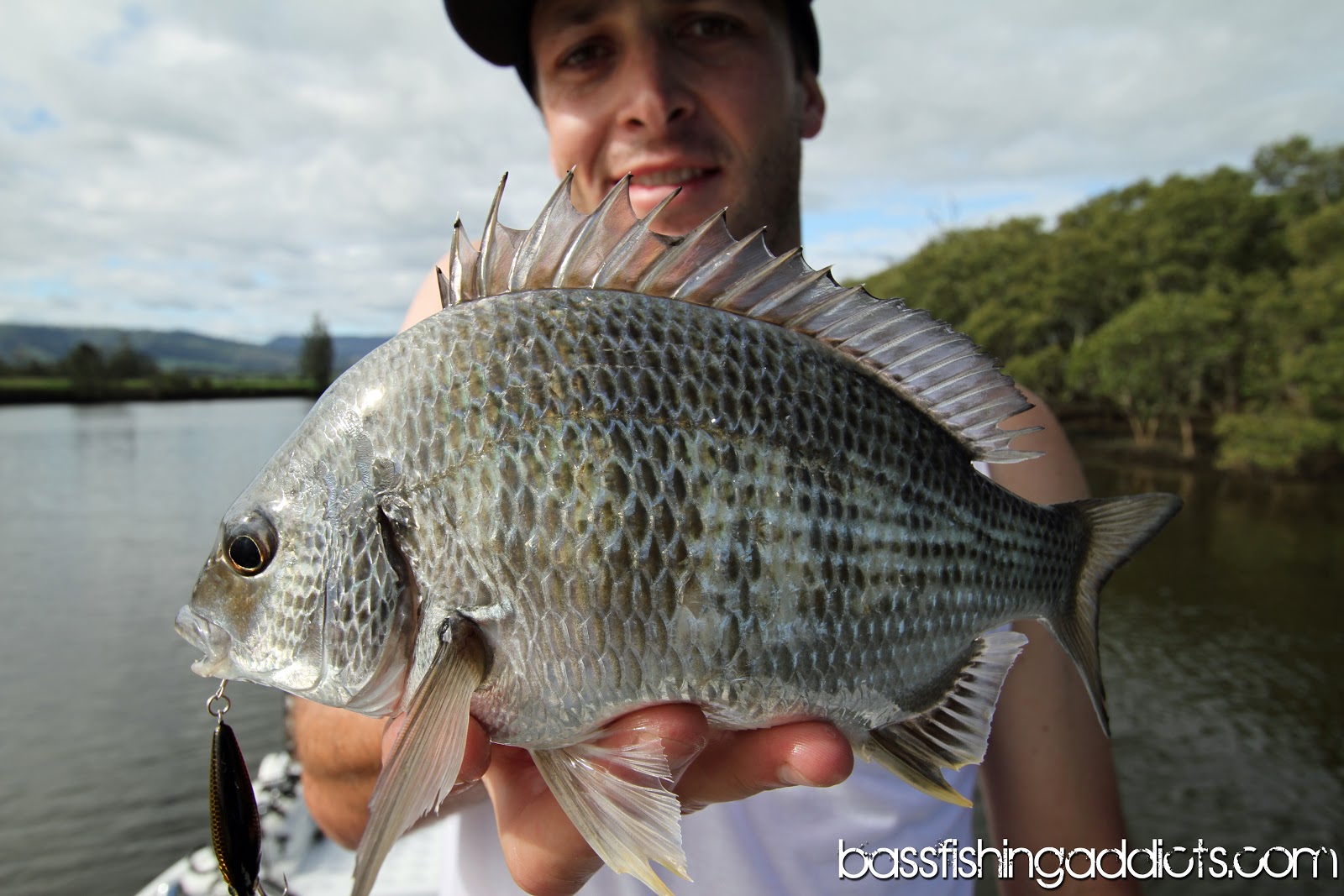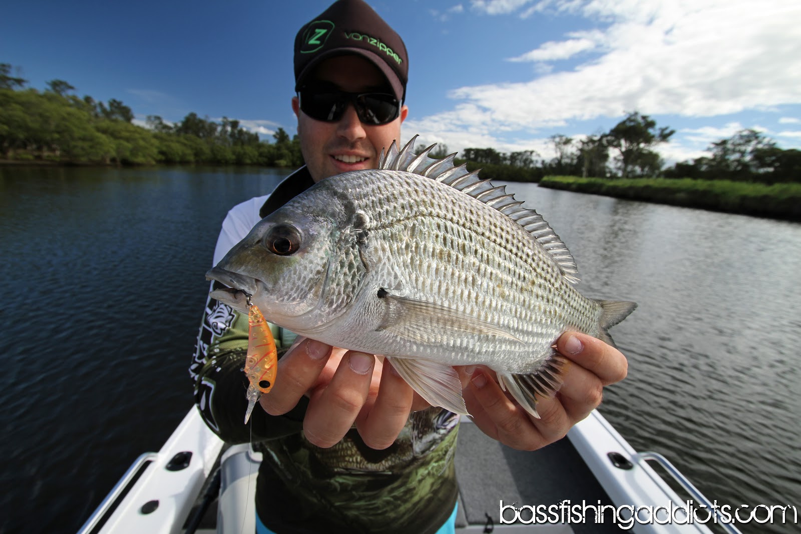 I had recently purchased a couple of Cranka Lures (Cranks & Shads) to improve the look of my tackle box and even though we had been having success on the weekend with the Daiwa SC Shiners, I always love to test out new lures. Chris stuck with the Shiner and I tied on a Cranka Shad in BBQ Prawn colour. We arrived at our spot that produced days before and whilst Chris belted out some cast, I rigged up. We felt a couple of taps but nothing with any substance until we reached the end of the corner, where the weed bank turns to Mangroves. A slow roll with a few twitches thrown in saw me produce the first fish of the afternoon, and thankfully it was our target species!