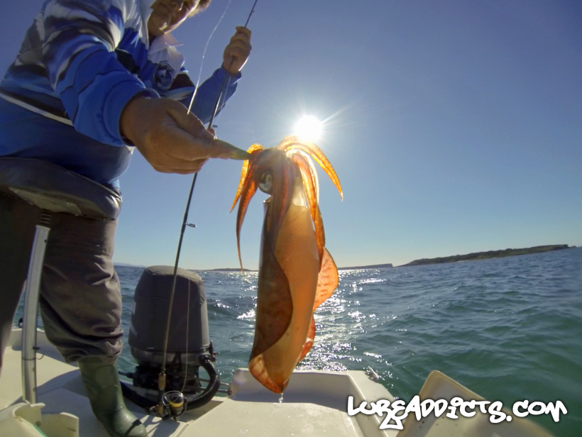 We set two rods out the side to drift some jigs using the action of the swell/chop to give them some movement, while we started casting in the other direction. Wes using a slow lift and drop technique, while I imparted a more violent 3 quick rips with a long pause. As we moved from 15 meters into the shallower water of 3-4 meters the first squid was hooked by Wes, followed by one of our drifting jigs, then shortly after I hooked up. We went over the same drift 4 times and ended up with 8 squid in the 45 mins we spent on them. Unfortunately I had my GoPro on the wrong setting, so I was only able to take screen grabs from the footage, rather than it taking photos.