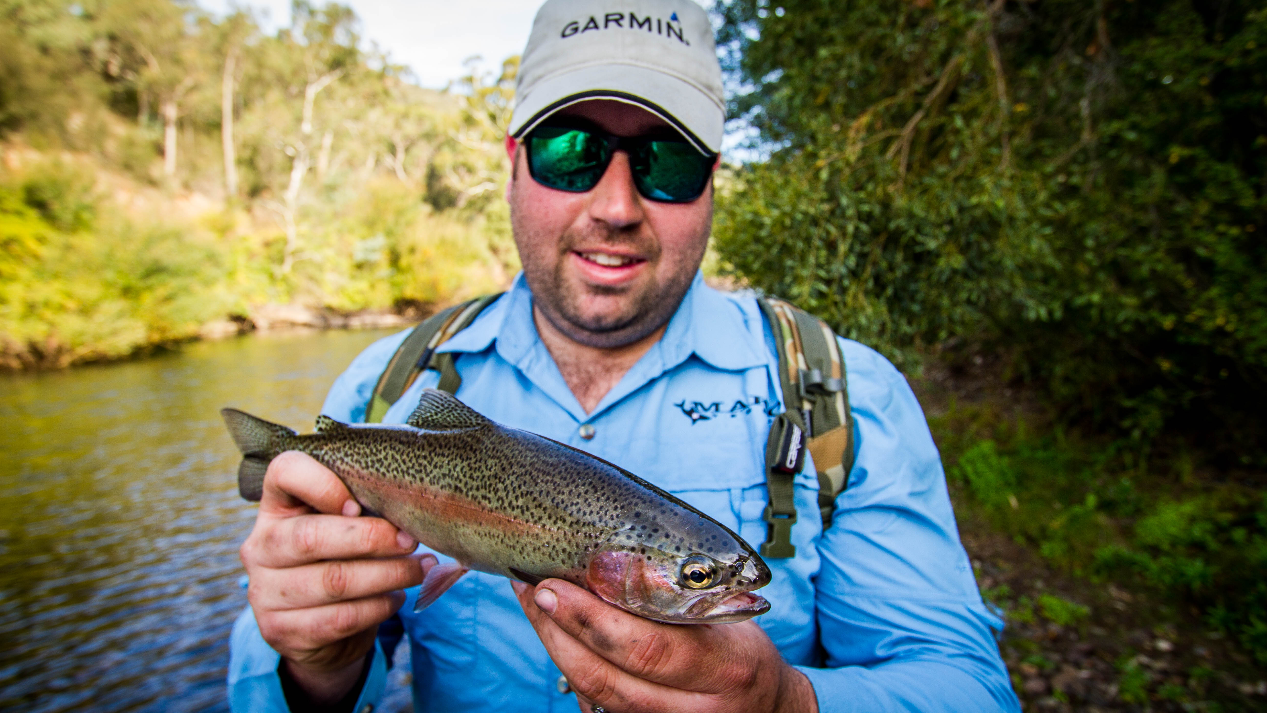 I had been watching the water levels on the daily river reports website that shows day by day historical release info from Blowering Dam, and all was looking good with it showing that it was in the 550 – 600 mega litres a day. We wandered over to the river and started flicking a run, which was quiet a lot shallower than the last time I had been there, but that was probably 12 months ago. We pushed up stream a little where the water was faster and deeper, and on the first cast in I hooked a nice little Rainbow on a Daiwa Double Clutch in the Yaname colour.