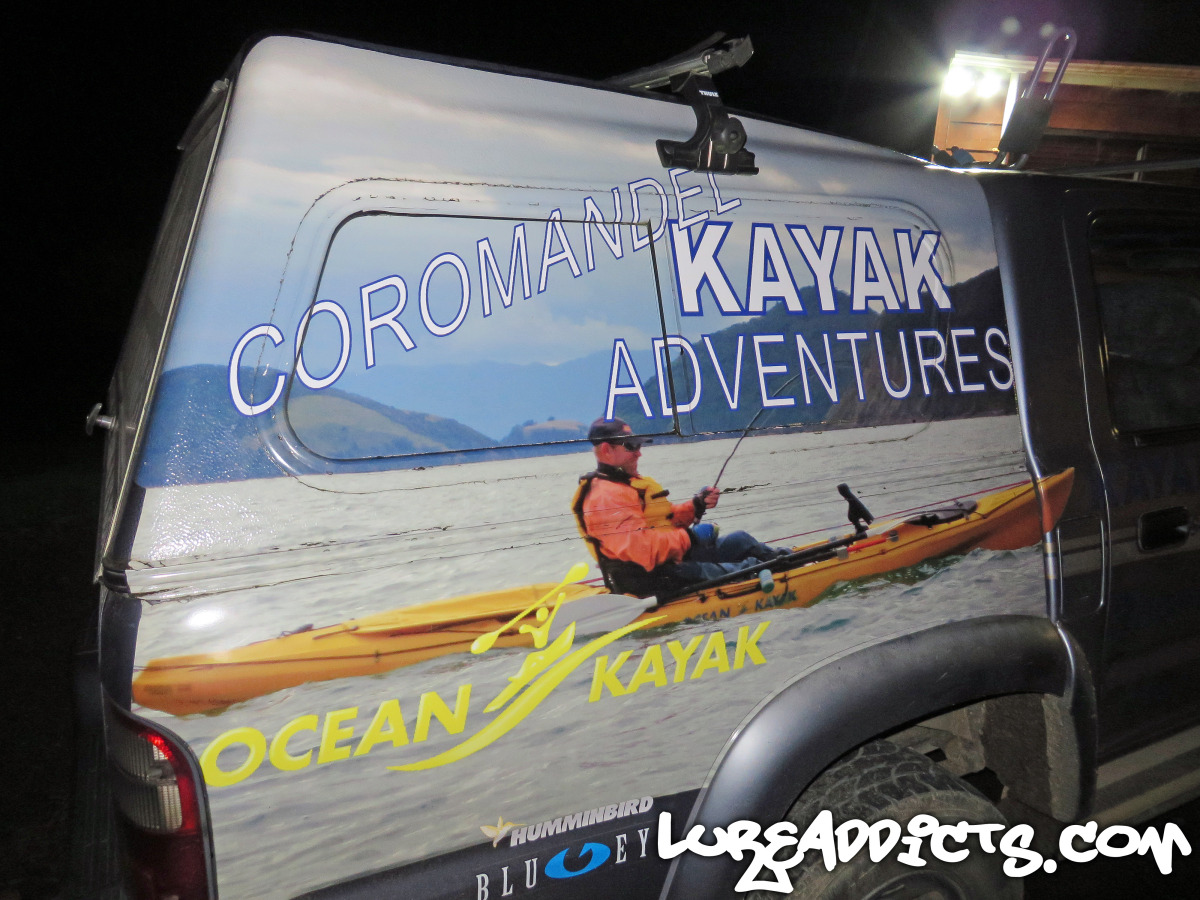 We landed in Auckland at 12.15pm and caught up with Steve from Blade Kayak Fishing Magazine who had only become aware of the delay once he had landed. We made our way to the pub for some drinks and food as the boys weren’t due in until 3.10pm and with further delays we didn’t see Andrew and Pat until 4.30pm. We met up with Rob’s wife Janet who was there to take us on the 2.5 hour drive to Rob’s house/shop where we met Rob and another kayaker Brad. We did a last minute shop and kit out of waterproof gear, were given some knife jigs and snapper rigs supplied by Bite Fishing NZ, brand new 385C DI Humminbird sounders supplied by BLA Australia and a run down of what the plan was for the next 6 days of fishing. With the weather prediction, Rob made the decision to hook up with Captain Peter McKenzi earlier than planned and take us off shore for the first half of the trip using the mother ship Te Wairoa (www.coromandelfishingadventures.co.nz) to take us from Kennedy Bay to the islands for some Kingfish and Snapper.